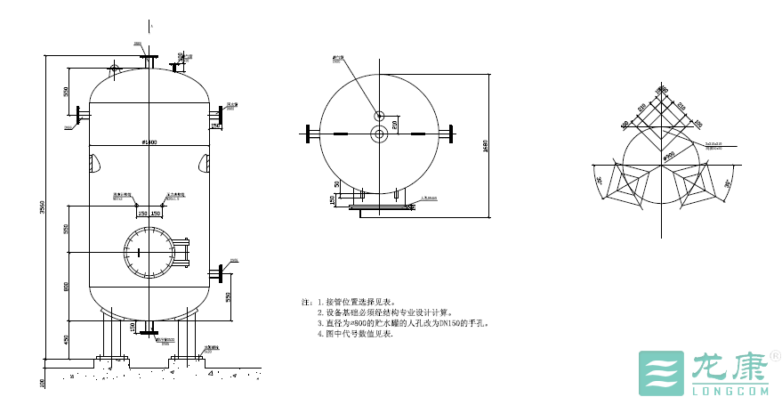 承压式贮水罐共有3种设计压力(0.25、0.6、1.0MPa),不锈钢采用进口SUS304B不锈钢板制作,不生锈、不生青苔、易清洗;碳钢壳体内外有防腐要求及外保温要求由设计者定。