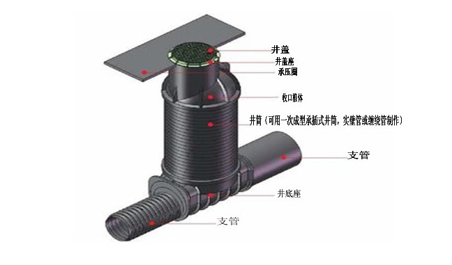 塑料检查井以高分子树脂为原料,采用组合结构,通常由井底座、井筒、井盖、盖座和混泥土支承板等组成。其中关键的井座部分采用一次性成型,可制造二通、三通、四通90°~165°任意交汇的所有规格检查井,以变径接头、可变角接头及密封圈等配件来达到改变管径及角度的连接。井筒采用PE管材、波纹管或缠绕管,可根据现场埋设深度截取相应长度,具有很大的灵活性。井筒、进(出)水管道与井座的连接采用橡胶密封圈柔性连接,可适应小范围的内角深度变化,施工方便快捷、密封性能好、永不渗漏、环保节能。