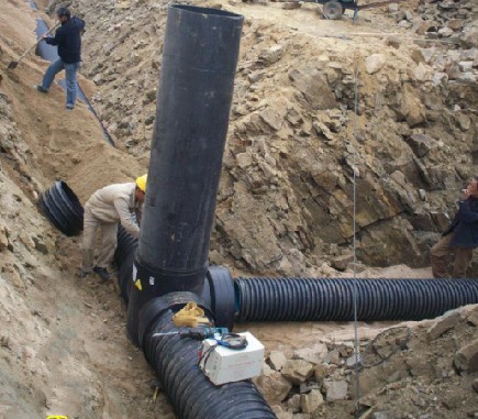 5、附加接头的安装,应根据井筒尺寸和连接管道的直径,采用专用工具在井壁上开孔,孔洞圆周边缘应平整,安装附加接头不得倒坡。